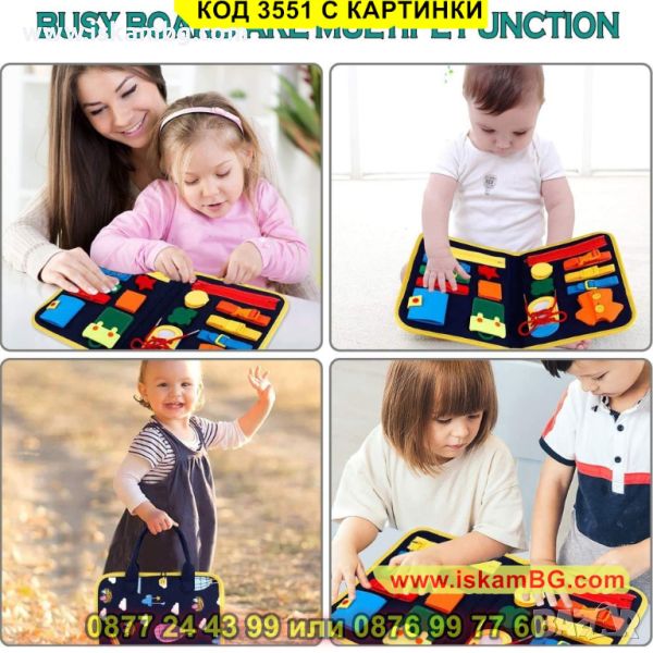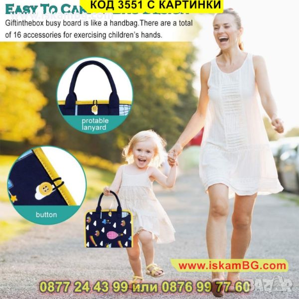 -> ПЪТУВАНЕ И ПРЕНАСЯНЕ: Лесна за носене от детето и пренасяне в багаж от родителя. Бизи борда осигурява дълго време занимание на мъниците, по време на път: в колата, самолета, автобуса и др. Когато се налага да се чака пред лекарския кабинет, на опашката в магазина или другаде