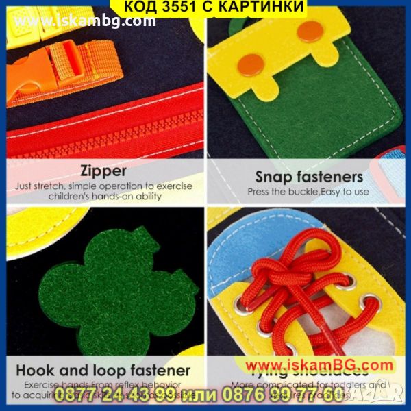 -> РАЗВИВАНЕ НА ФИНАТА МОТОРИКА: Създадени за малки ръчички, катарамите и копчетата са умишлено направени да имат различни нива на трудност, насърчавайки 1 - 2 - 3 годишните дечица да развиват уменията за решаване на проблеми и постоянство, докато играят.