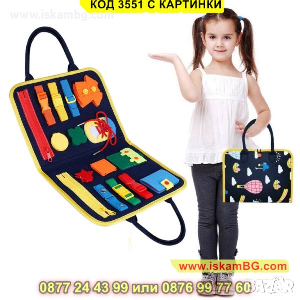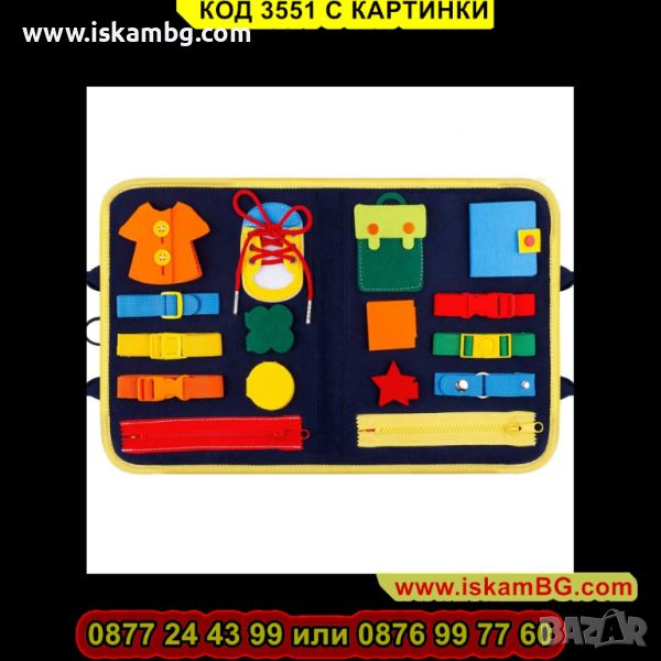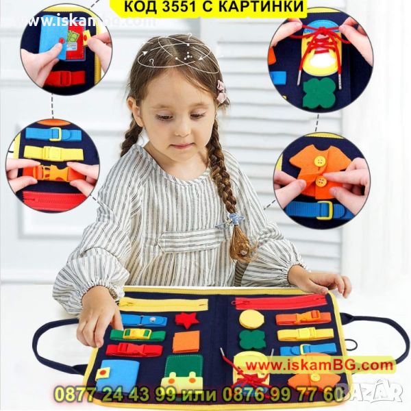 Бизиборд представлява сгъваема мека дъска с много различни дейности, предназначена да помогне на детето да експерементира и да придобие знания и умения чрез игра и забавления.