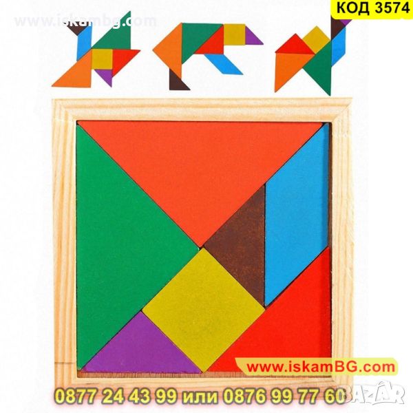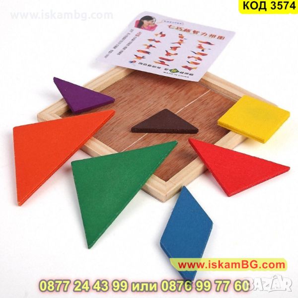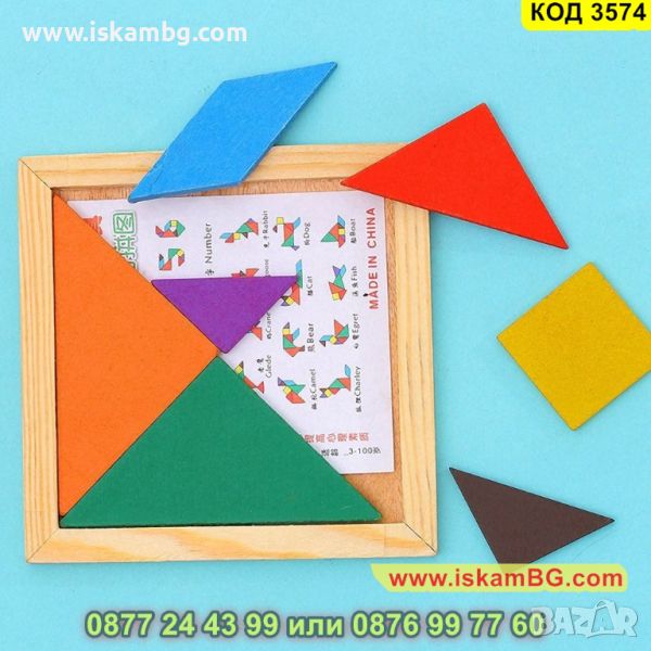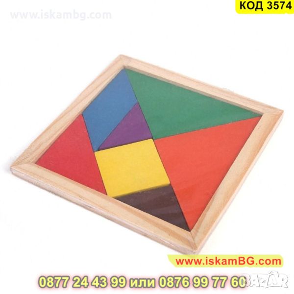 Танграм пъзел от 7 части с рамка 14.5х14.5см. изработен от дърво - КОД 3574