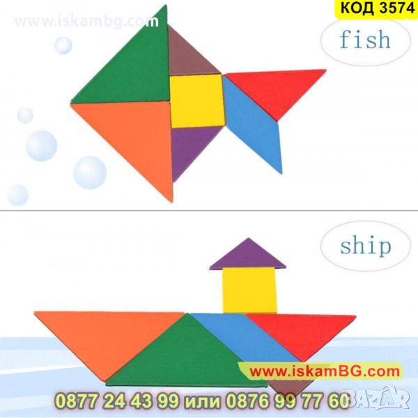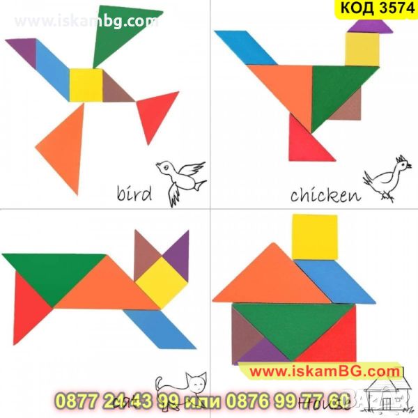Танграм пъзел - игра от китайски произход със седем плоски геометрични форми предизвиква децата да създават най - оригиналните изображения с помощта на включените в комплекта шаблони и посредством доза въображение.