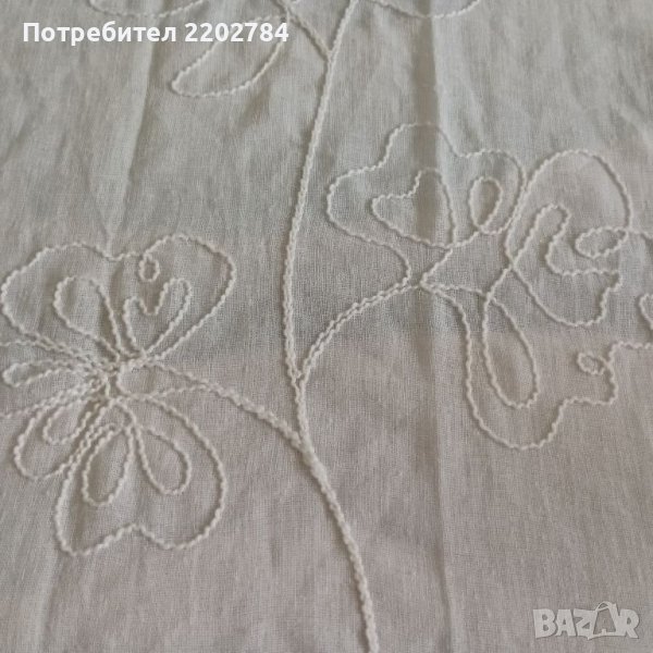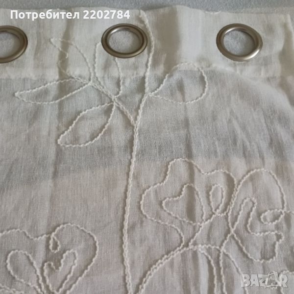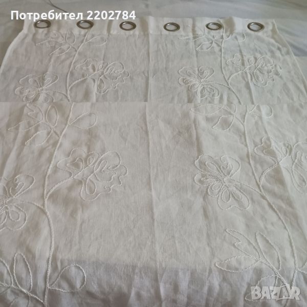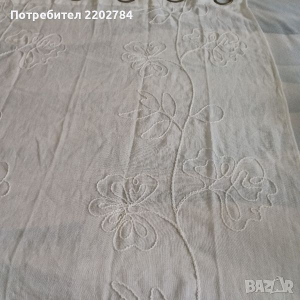 Второто е бяло, полупрозрачна материя с много красиви вертикални бродерии на цветя.Бродериите са от плътен,дебел конец и затова са с много изразен релеф.