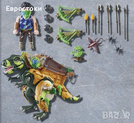 T-Rex има подвижна броня с устройство за хвърляне на камъни, двойни оръдия отстрани и много други аксесоари. С правостоящо място за Иън върху бронята. Включва 1 фигура. Пуснете динозаврите навън с PLAYMOBIL Dino Rise!