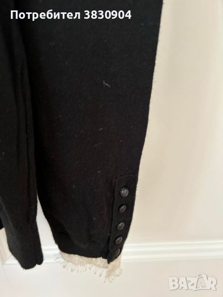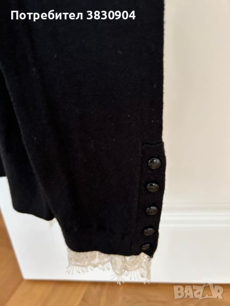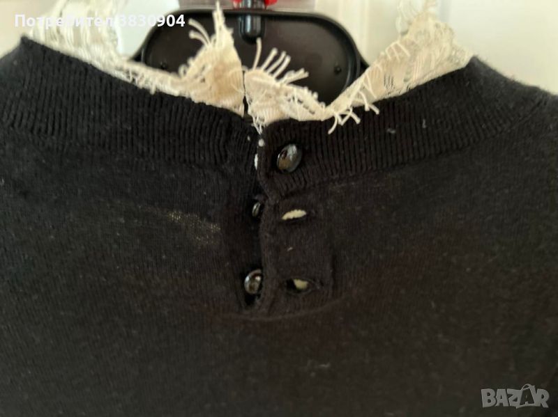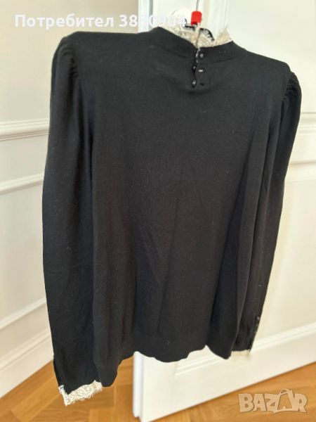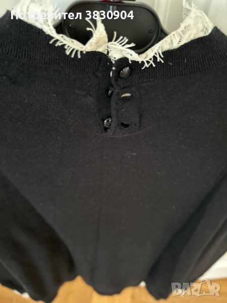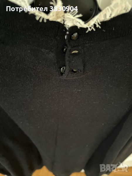 дантела на яката и на маншетите. Блузата се закопчава на гърба с три копчета. Ръкавите