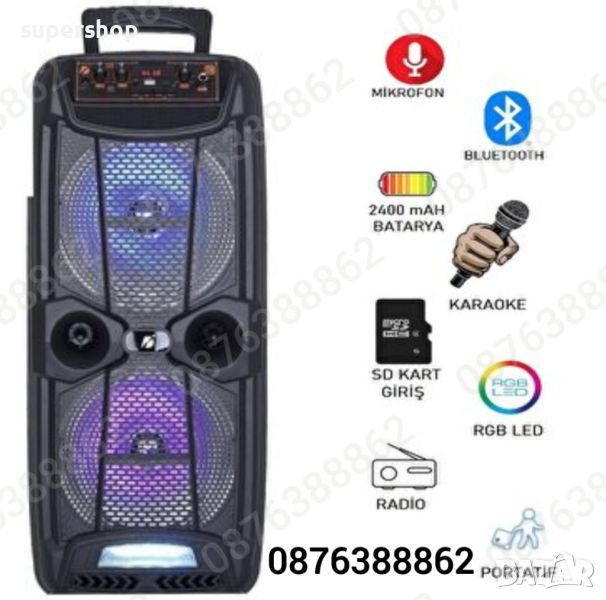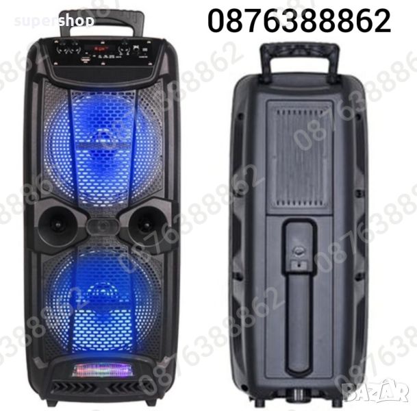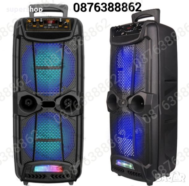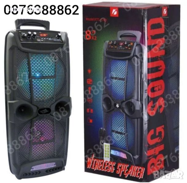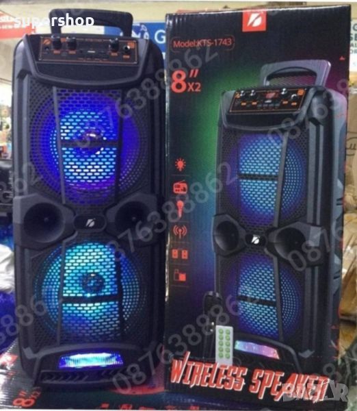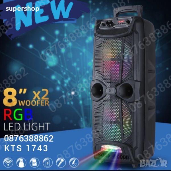 Нов Модел Караоке Тонколона KTS 1743, 2х 8” инча басов високоговорител, с вградена акумулаторна батерия, BLUETOOTH, МP3 плеър от SD карта или флашка, жичен микрофон за караоке, и светлинни ефекти.