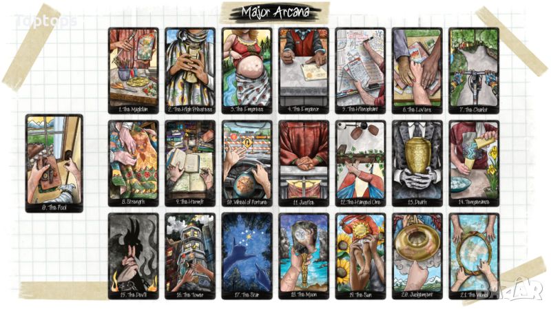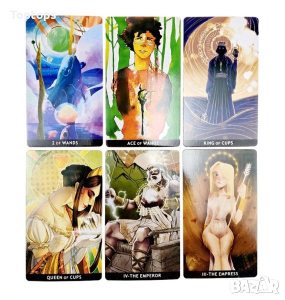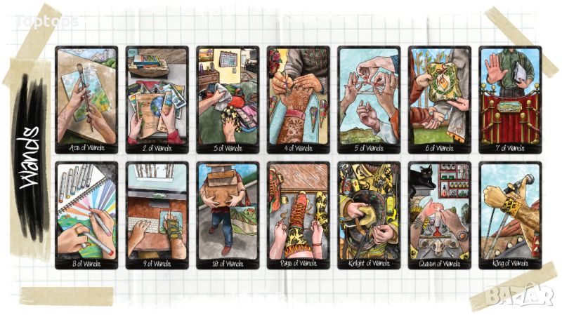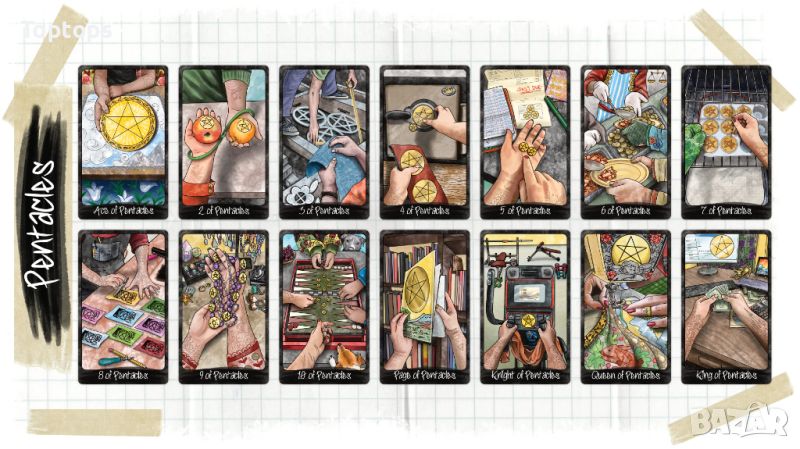 - 78 таро карти - Out of Hand Tarot с pdf книжка с указания на английски. Размерът им е 10,5см х 6,3см, колодата е създадена от Jamie Sawyer.