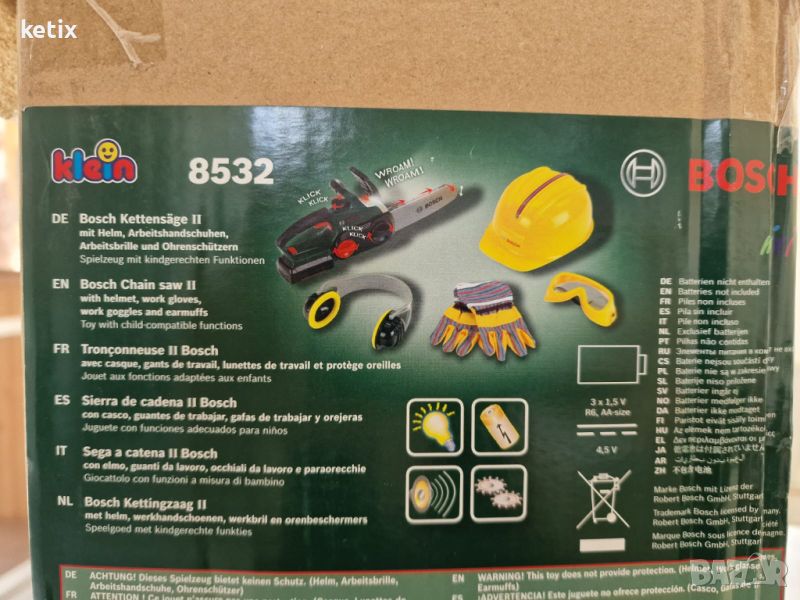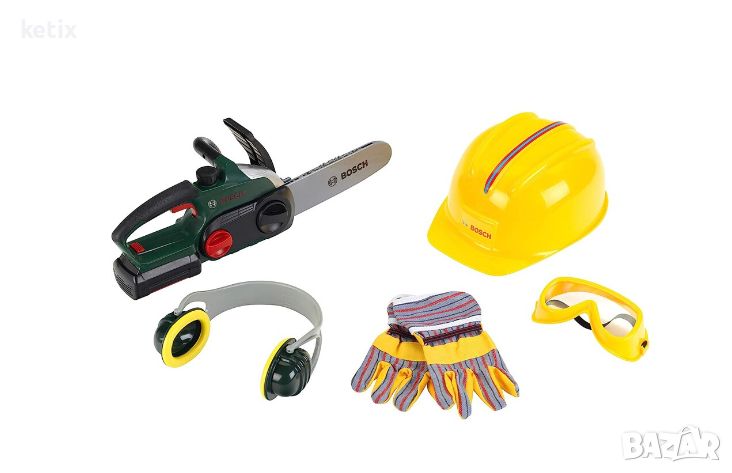 започнете като истински майстор с играчката трион на Theo Klein Bosch. Верижният трион изглежда като оригинала, но има удобни за деца функции. Трионът издава реалистичен шум при рязане и мига светлината, която се активира по време на рязане. Погрижено е и за безопасността с предоставените строителна каска, работни ръкавици, предпазни очила и защита за слуха.