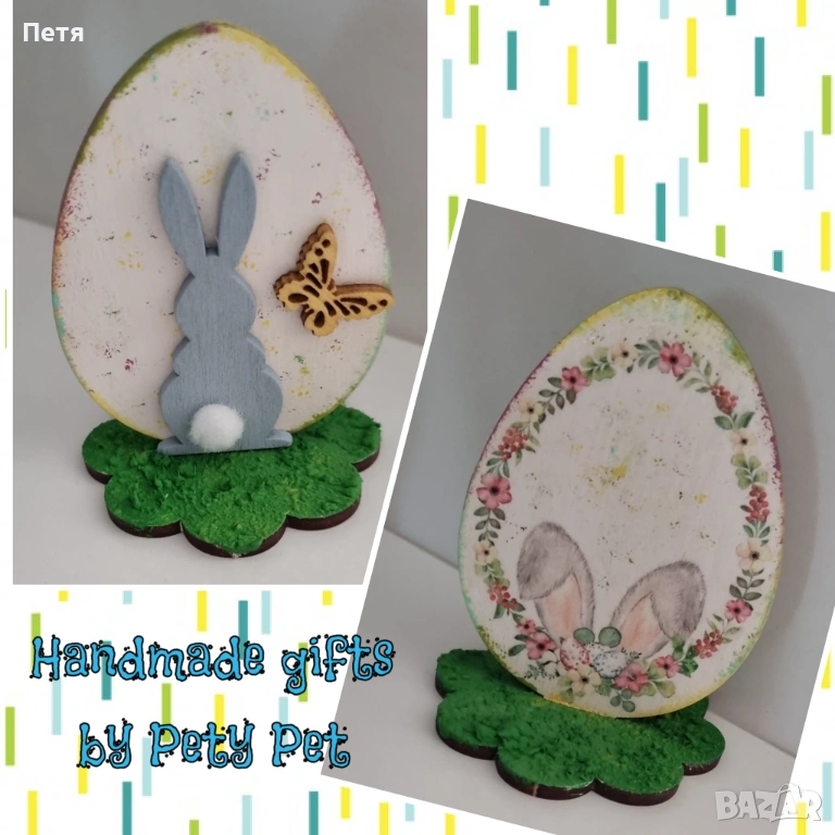 Зайчето е двустранно декорирано, височина 9см. с поставка. Цена 3 евро.