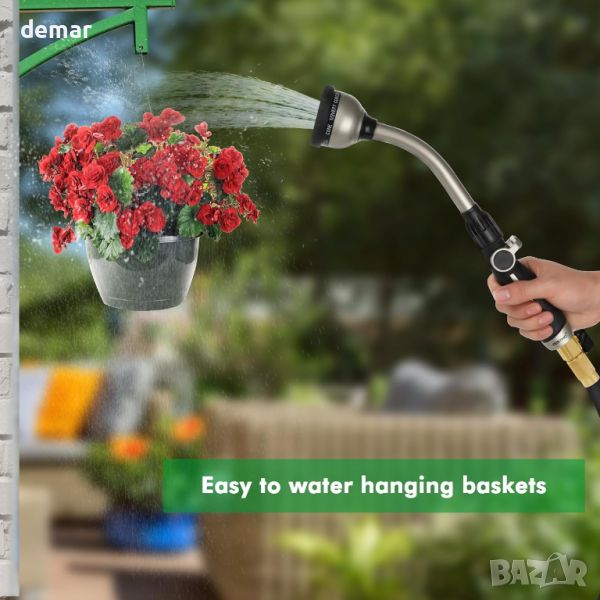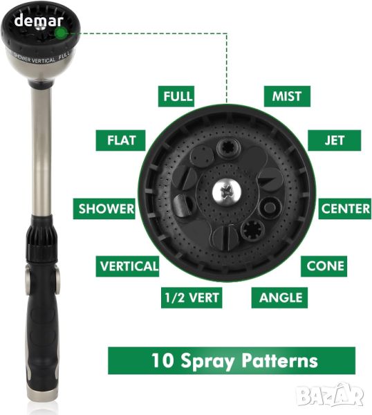 Изработена от първокласна цинкова сплав, тази 42-сантиметрова пръскаща тръба е изключително издръжлива, включваща бронзово прахово боядисване, TPU покритие и гумиран циферблат за допълнителна устойчивост срещу удари и тежка употреба. С пръскачка с маркуч за управление с палец превключвайте без усилие между включване/изключване и поливане с високо/ниско налягане, благодарение на своя противоплъзгащ се гумиран контролер на потока. Предлагащ 10 модела на поливане, от душ до мъгла, този универсален инструмент покрива всичките ви градински нужди. Неговият ергономичен дизайн осигурява комфорт за ръце от всякакъв размер, докато съвместимостта му със стандартни градински маркучи и уплътнението без течове го правят надежден избор за дългосрочна употреба.