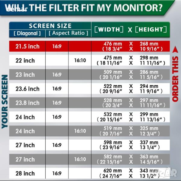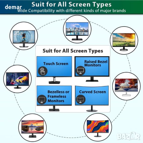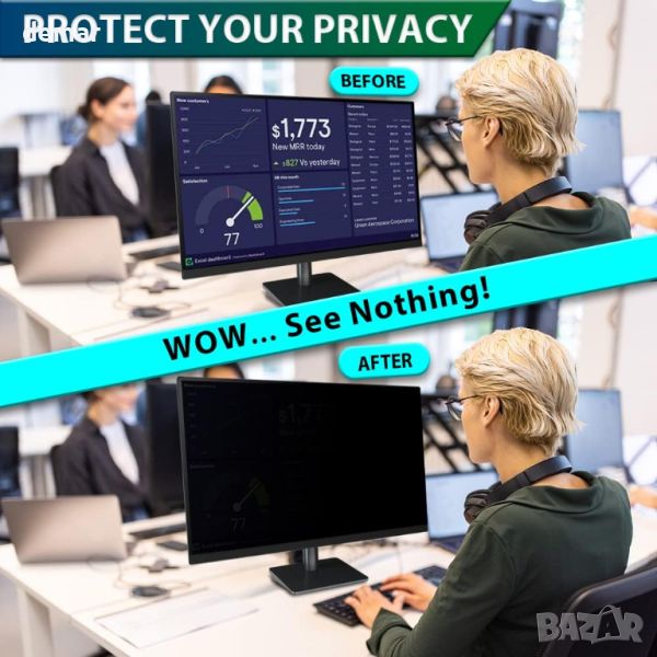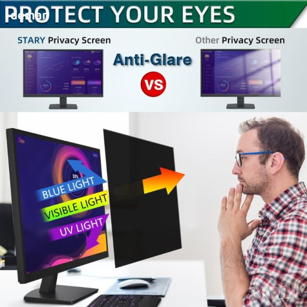 Stary 21,5-инчов компютърен екранен филтър за поверителност, предназначен за обществени зони и места с голям трафик. Проектиран за съвместимост с различни марки монитори, включително HP, Samsung, Dell, Lenovo, Acer, Asus, LG и ViewSonic. Осигурете прецизно пасване, като потвърдите измерванията на ширината и височината. Този щит за поверителност предлага ясна видимост за вас, докато затъмнява екрана от ъгли (30°-60°), с регулируеми нива на поверителност. Той предпазва очите, като филтрира 97% UV, намалява синята светлина с 66% и прихваща 95% от отразената светлина, с опции за лъскаво или матово покритие. Лесен монтаж със залепващи ленти или плъзгащи се монтиращи пластини за екрани с повдигнати рамки. Защитете екрана и зрението си с това решение против отблясъци, устойчиво на надраскване.