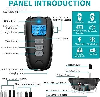 Предимства на нашите продукти: Безжично управление за дистанционен обхват до 1650 фута. 5 регулируеми тренировъчни режима, безопасни и ефективни. Звуков сигнал, аварийни светлини, вибрация от 00 до 99 нива, шок от 00 до 99 нива и защитен режим на заключване на клавиатурата.