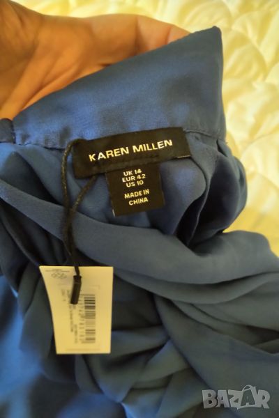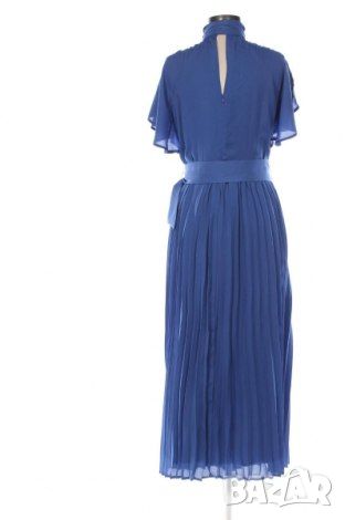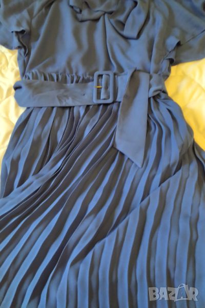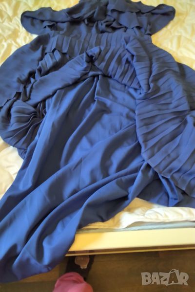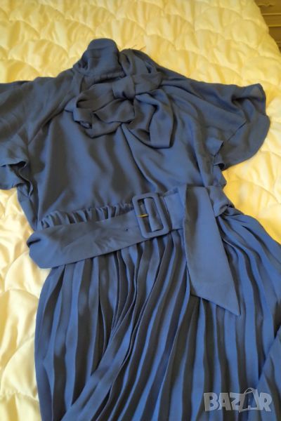 Нова с етикет Страхотна рокля в цвят кобалт .размер 42 Л полиестер Изработена от лек плат жоржет, тази рокля се спуска по силуета, с ангелски ръкави, добавящи ефирен елемент. Детайл с висока яка и папийонка Дължина 135см мишници 45 едностранно талия 44см Крайна цена без бартери.Продавам я защото ми е дълга и голяма ,поради зачестили злоупотреби не изпращам със проба