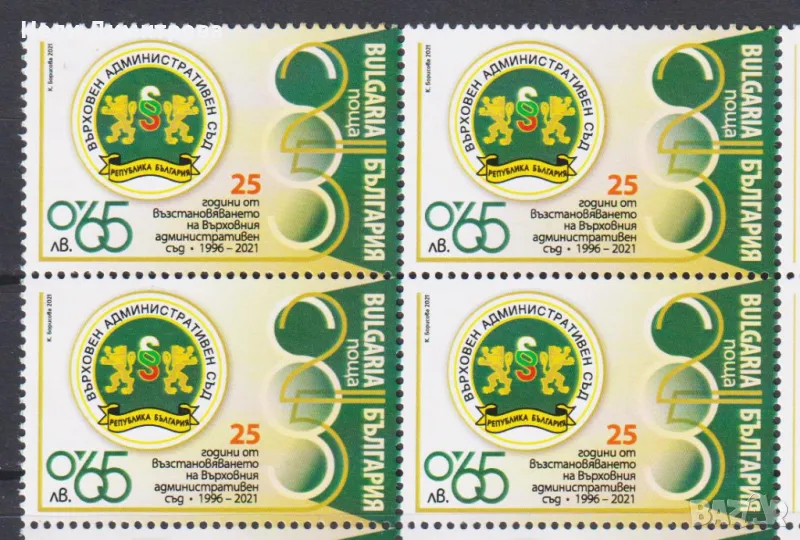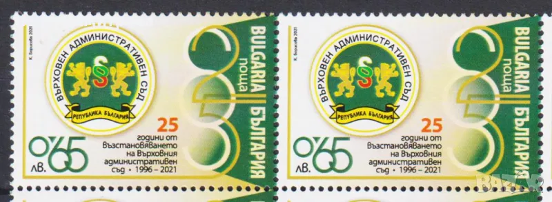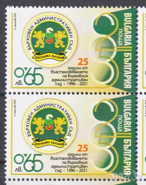 1. Чиста марка 25 години Върховен Административен Съд 2021 от България. Тираж 7100. Цена € 0,75 (сн. 1)