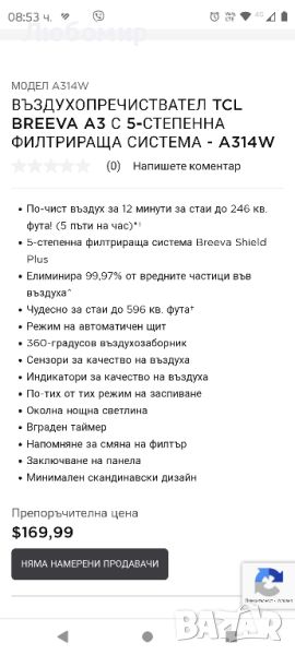 Интелигентен пречиствател на въздух TCL Breeva A3 с 5-степенно почистване, истински HEPA (H13), → Обява 45294592