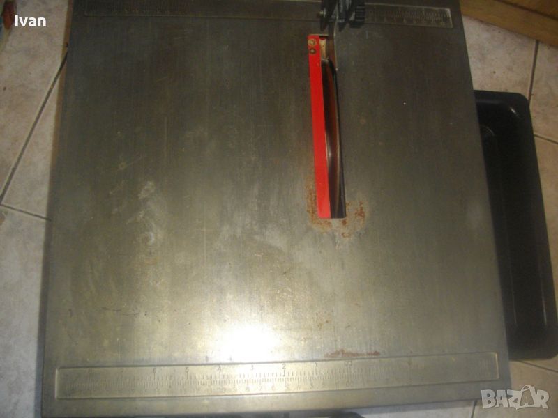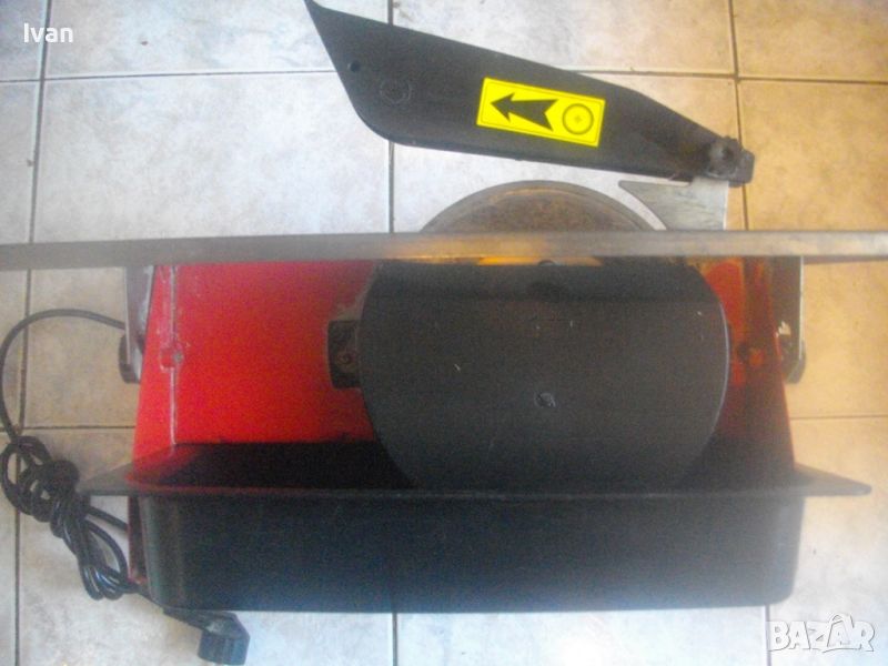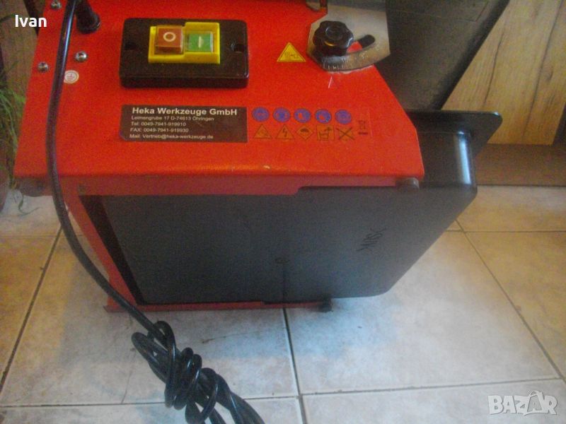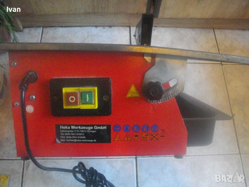 Производство - немско оригинално. Производител - HEKA Werkzeuge GmbH.Машината е за сухо и моркро рязане на плочи/плочки всякакви без мрамор - фаянс, теракот, гранитогрес, керамика, камъни, гнайс, тротоарни бетонови плочи и др. с дебелина до 33-35 мм. За дискове размер ф 180 мм х 22,2 мм диамантени. Машинате с поставен оригинален немски диск диамантина - почти нов. Налична вана оригинална на машината за вода при мокро рязане. Ъгъл рязане 0-45 градуса. Мощност на мотора - 600 вата, скорост - 2950 об/мин. Метална масивна основа и корпус на машината- Метален плот с размери 390 х 400 мм. Височина на машината с диска - 220 мм.