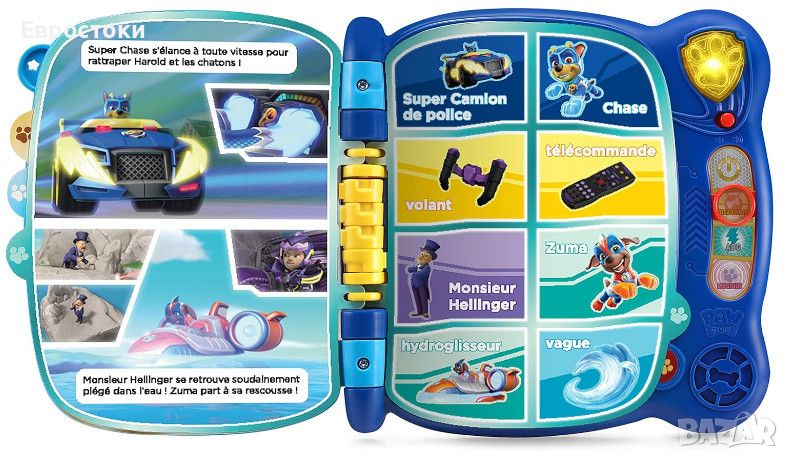 Детската интерактивна книжка Пес Патрул има 10 сензорни страници, с помощта на които децата могат да учат нови думи и звуци заедно с любимите си герои по игрив начин.
