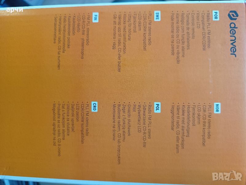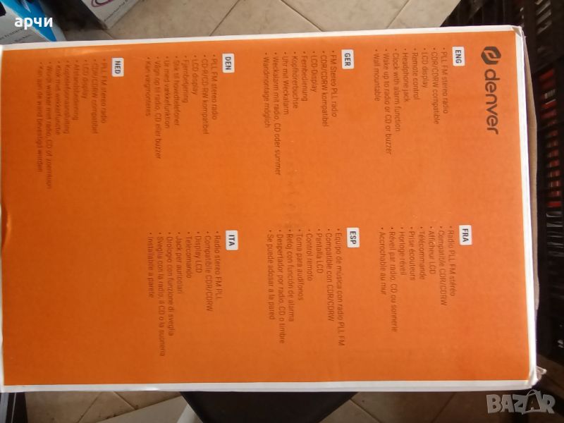 aiwa Hi-Fi Stereo Denver MC-5220 Denver MC-5220 CD плейър и FM радио Възпроизвеждайте CD, CD-R и CD-RW и, ако желаете, настройте радиостанцията за себе си - модерната микросистема Denver MC-5220 е оборудвана със CD устройство и FM PLL тунер. . CD устройството има по-малко традиционна вертикална позиция. Когато възпроизвеждате CD, можете да го настроите да повтаря една песен, всички песни или да програмирате 20 песни по ваш избор. Можете също така да свържете вашия музикален източник към устройството с аудио кабел с 3,5 mm жак конектор, тъй като е оборудван с AUX вход. Дистанционното управление, включено в пакета, ще бъде полезно за удобно управление на CD плейъра. Микросистемата Denver MC-5220 има два 1W високоговорителя зад отлично качество на звука. Можете също така да свържете кабелни слушалки, моделът е оборудван с изход за слушалки. LCD екранът с подсветка информира за състоянието на устройството. Този модел може дори да се окачи на стената. Необходимо е да се свържете към мрежата, препоръчително е да поставите 9V батерия в микросистемата, за да предотвратите нулирането на часовника в случай на прекъсване на захранването. Модерното устройство има функция будилник и ви събужда с аларма или музика от радиото или CD.Технически параметри:CD плейър - вертикално положениеФункция за повторение за една или всички песниМогат да бъдат програмирани 20 песниPLL FM радиобудилник - опция за събуждане чрез радио, CD или зумеризходна мощност: 2 x 1W RMSLCD дисплей с подсветкаAUX входжак за слушалки (не е включен)дистанционно за CD плейърстенен монтажзахранване: AC 230V, 9V батерия за поддържане на часовника (не е включена)размери: 30,5 х 11 х 22,5 смтегло: 1,3 кг Виж и: ТелевизориСпецификацииОБЩИ ХАРАКТЕРИСТИКИТип продуктМикро системаСвързаностAUXБрой канали2ТехнологияС каб