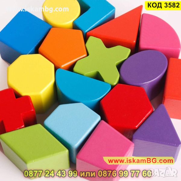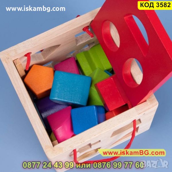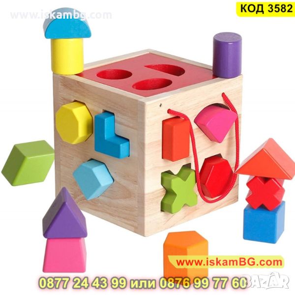 Монтесори Куб за сортиране на геометрични фигури изработен от дърво - КОД 3582