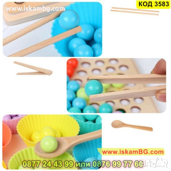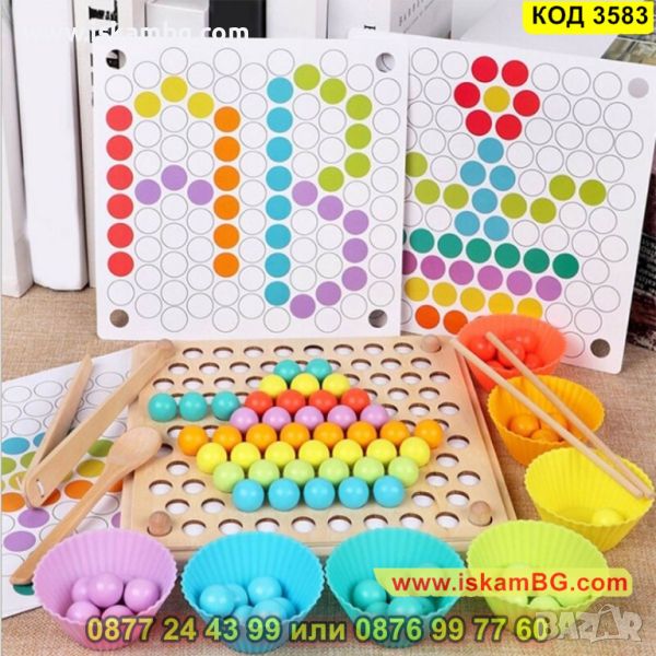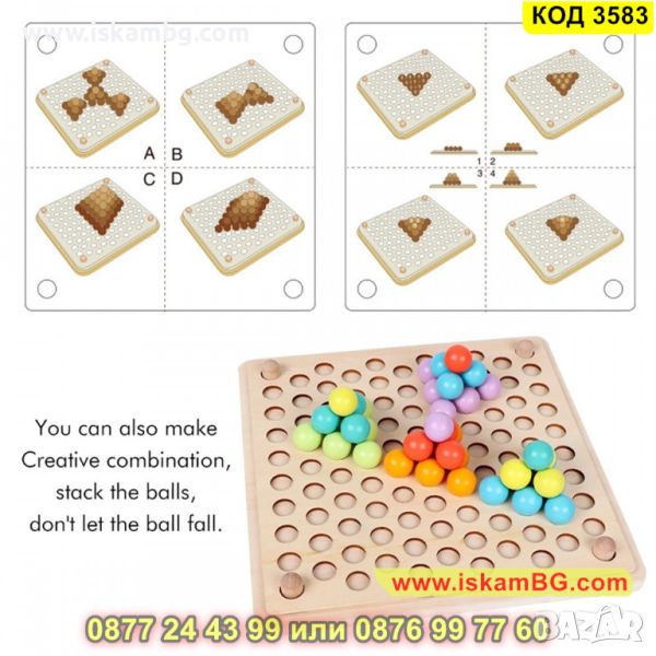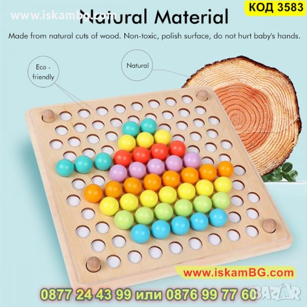 Дървената мозайка с топчета предлага чудесен начин за забавление с родителите. подреждайте заедно различни композиции, като използвате топчетата с различни цветове. Комплектът включва примерни модели, които могат да бъдат създадени от елементите, включени в комплекта.
