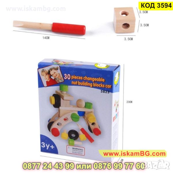 Дървеният строителен конструктор е един чудесен начин, с който децата могат да развият своите умения, да се научат да разпознават различните цветове както и да подобряват координацията си. Комплектът включва 30 части, които дават възможност на малчуганите да създадат различни предмети, животни, коли и други. Дава се пълна свобода на въображението. Този строителен комплект се състои от болтове, винтове, летви, колела и детска отвертка и е подходящ за деца над 3 годишна възраст.