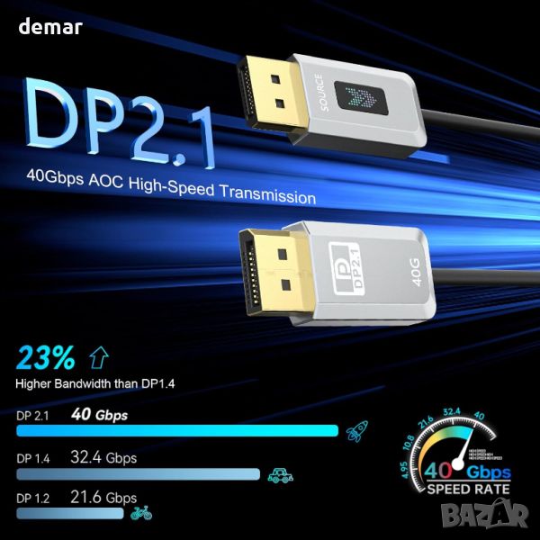 DisplayPort 2.1 оптичен кабел, осигуряващ предаване на дълги разстояния без загуба и имунитет към електромагнитни смущения за стабилен, високоскоростен трансфер на данни, осигуряващ печелившо игрово изживяване. Съвместим с FreeSync и G-Sync, той поддържа 3D, HDR, HBR20, HDCP 2.2, Dynamic HDR, DSC1.2a, UHBR10, ALLM и VRR, с предаване на 32-bit/1536kHz аудио канал. Създаден за ентусиасти играчи на електронни спортове, включващ четириядрено оптично влакно, вътрешно екраниране, дизайн без резе и 24K позлатен конектор за издръжливост. Съвместим с DisplayPort 2.0/1.4/1.3/1.2/1.2A/1.1/1.0 и популярни графични карти за игри като RTX 4090, 7900xtx, 4080ti, 4070ti, 3090, 3080, осигурявайки безпроблемна свързаност за кристално чисто аудио и HD видео.