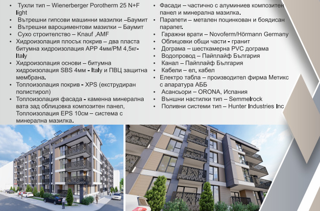 Обекта се изгражда по най-съвременни технологии и се използват висококачествени строителни материали! Налични едностайни, двустайни, тристайни, четиристайни апартаменти. Възможност за допълнително закупуване на гаражи, подземни гаражи, подземни и външни паркоместа! ВЪЗМОЖНОСТ ЗА ДОГОВАРЯНЕ НА ГЪВКАВА СХЕМА НА ПЛАЩАНЕ!