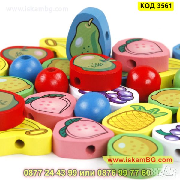 Монтесори фигурки за нанизване 63 бр. - Плодове и Зеленчуци изработени от дърво - КОД 3561
