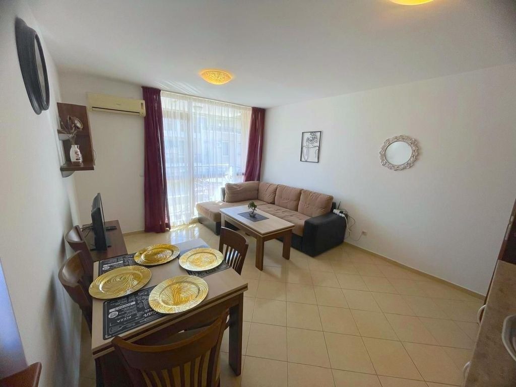 Апартамента се намира на 200м от плажа в прекрасният к-с РИФ2. Комплекса разполага с басейн, детска площадка, паркинг, охрана, видеонаблюдение. Апартамента е в отлично състояние, състои се от: входно антре, дневна с кух. бокс, спалня, баня с тоалетна и тераса.