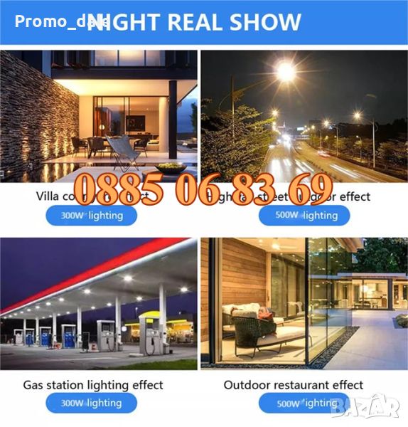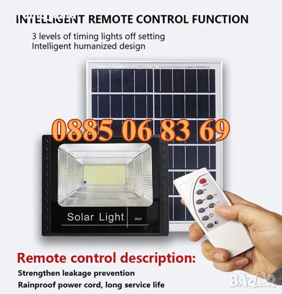 Автоматично превключване при здрач и разсъмване. Дистанционно управление, което може да се използва за настройване на продължителността на светене до 3, 5 или 8 часа, а яркият режим - до полу-светъл или напълно ярък режим. LED прожектора, е водоустойчив прожектор с IP степен на защита IP66 и е подходящ за осветяване на вътрешен двор, билборд, градина, пътека, гараж и др.