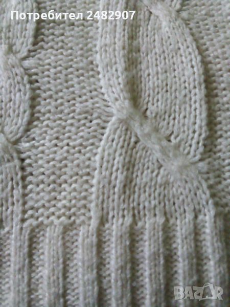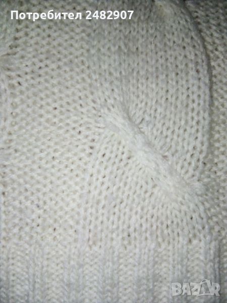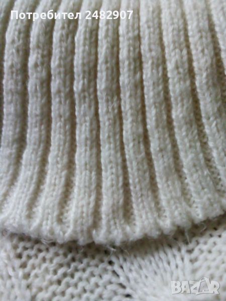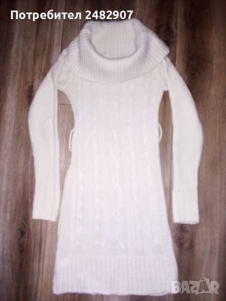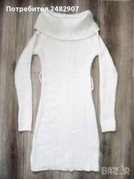 Бяла машинно плетена дамска туника с голяма поло яка, размер XS. Ширина под мишниците - 37 см, ширина в долната част - 42 см, дължина от деколтето до долу - 85 см, дължина на ръкава от деколтето до долу - 64 см, ширина на ръкава в долната част - 8 см, височина на полото - 23,5 см, ширина на полото - 42 см. Много запазена, почти не е използвана, отлично състояние, без забележки, с широки гайки на талията.