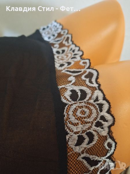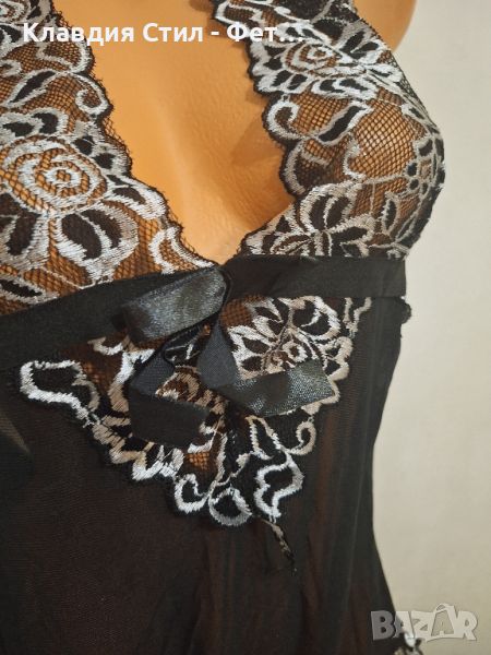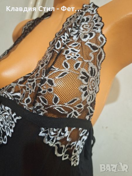 Красива дамска нощничка с прашка, моделът е от фина нежна материя, украсен с прекрасна черно бяла дантела, с открит гръб като се връзва на шията