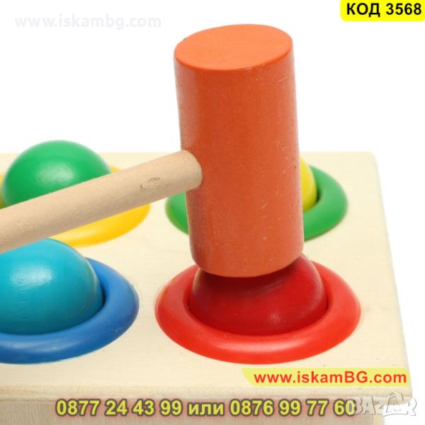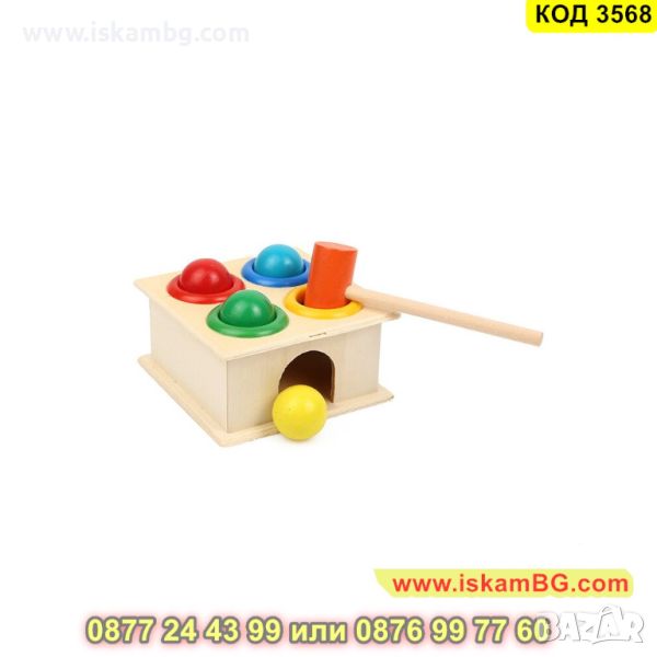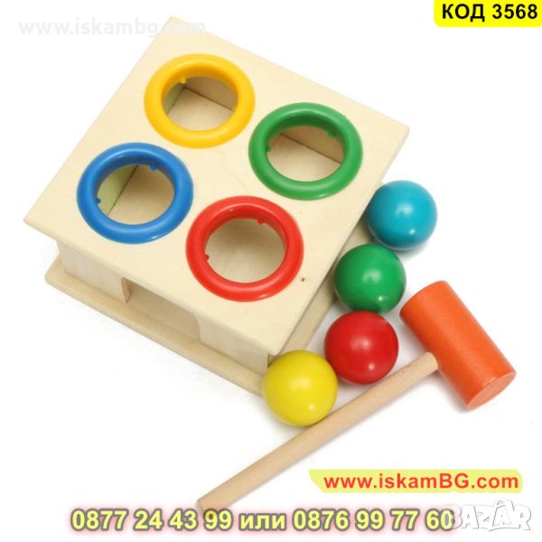 Страхотна играчка за деца, която се състои в почукване на цветни топки с чук. Играчката учи на концентрация и има положителен ефект върху развитието на дизайна и координацията на движенията.