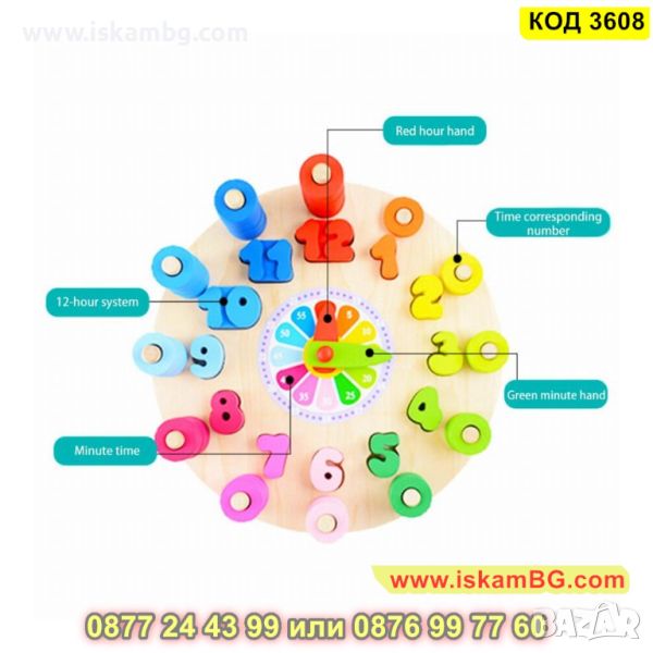 Детски дървен часовник-пъзел за обучение - КОД 3608
