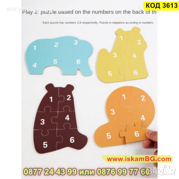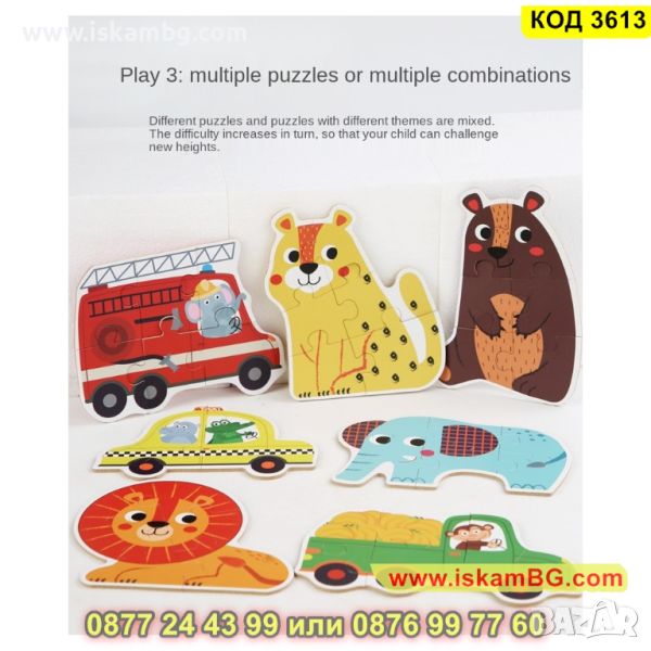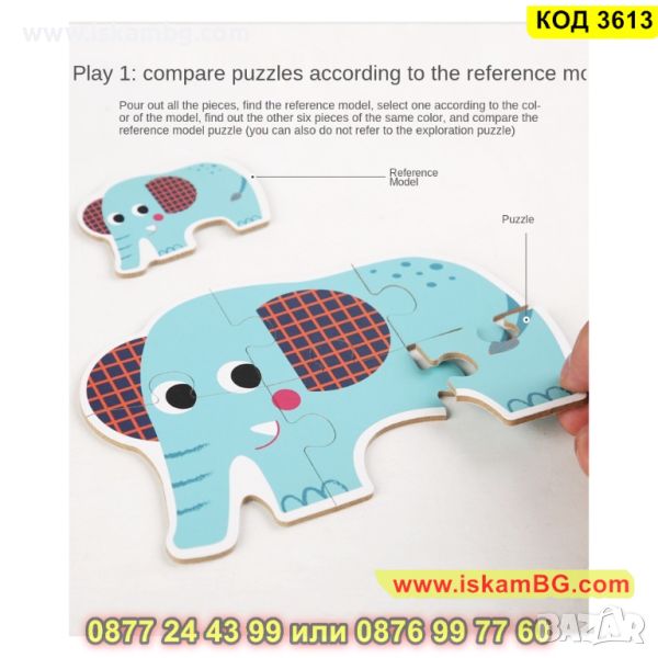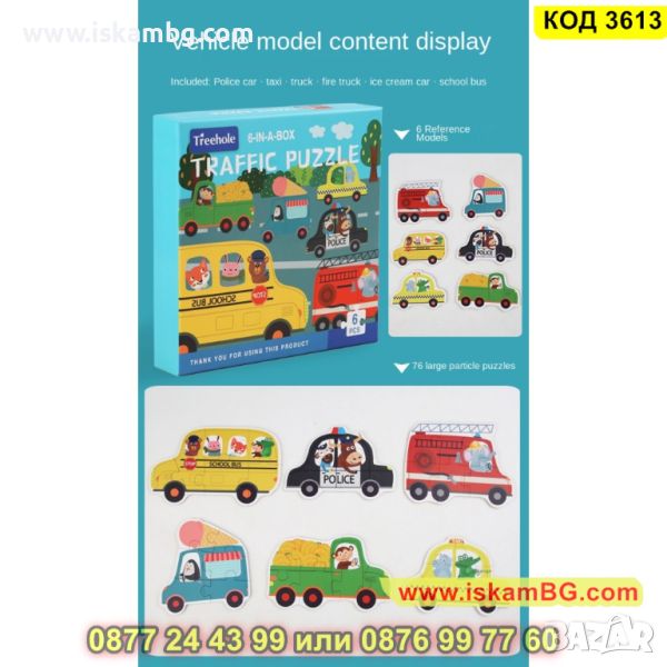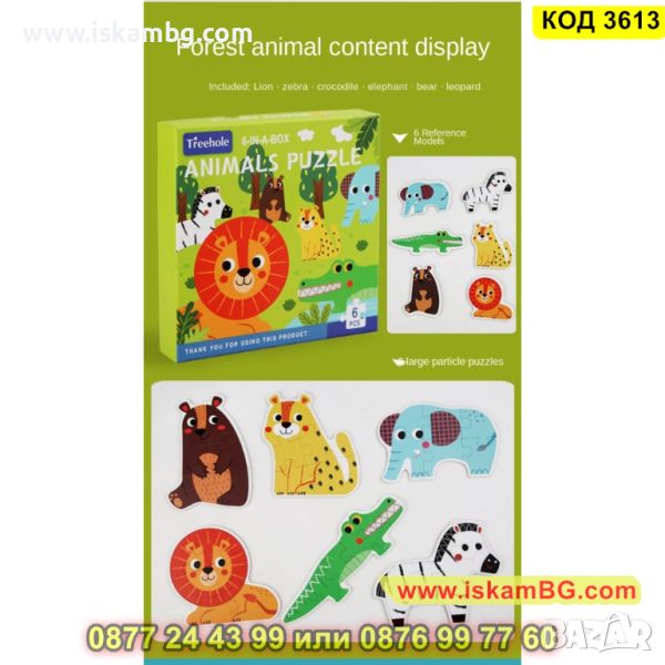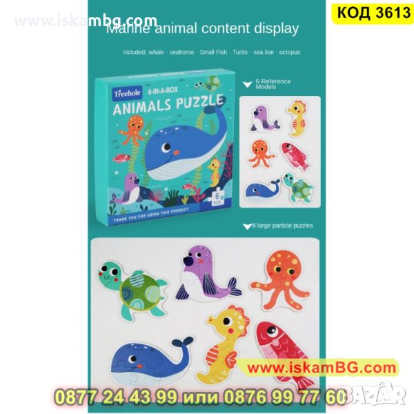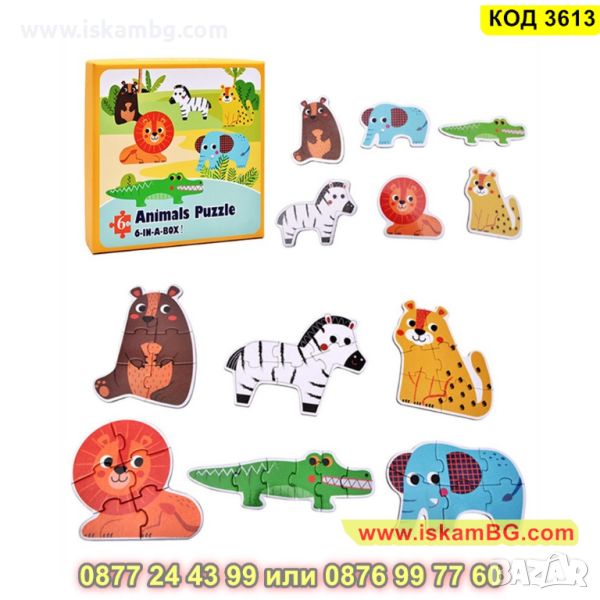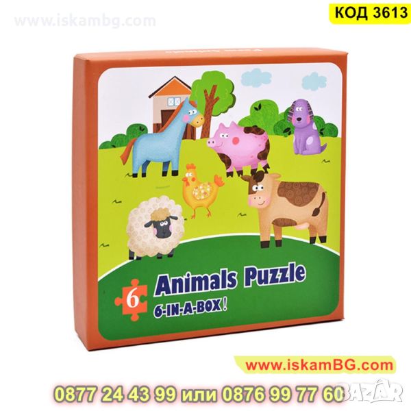 Кутия с 6 големи пъзела за сглобяване и 6 бр. малки фигурки по които да се гледа, как трябва да се сглоби пъзела