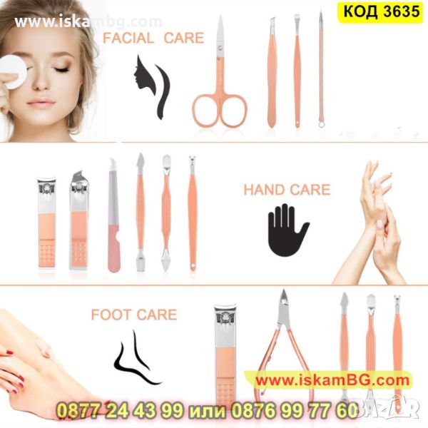 С компактен дизайн и стилно оформление, този набор включва всички необходими инструменти за оформяне, подрязване и полиране на ноктите, както и грижа за краката.