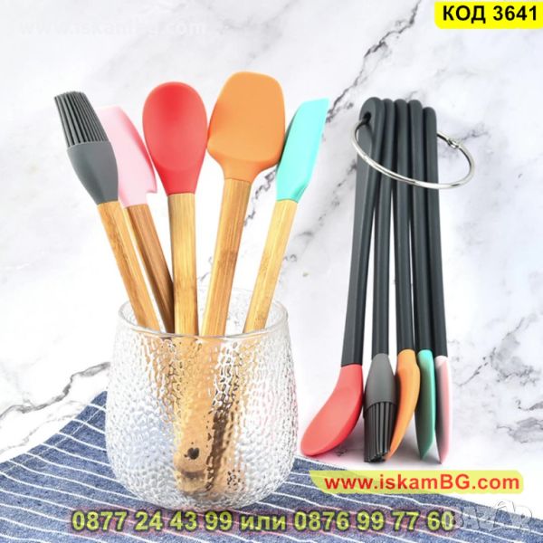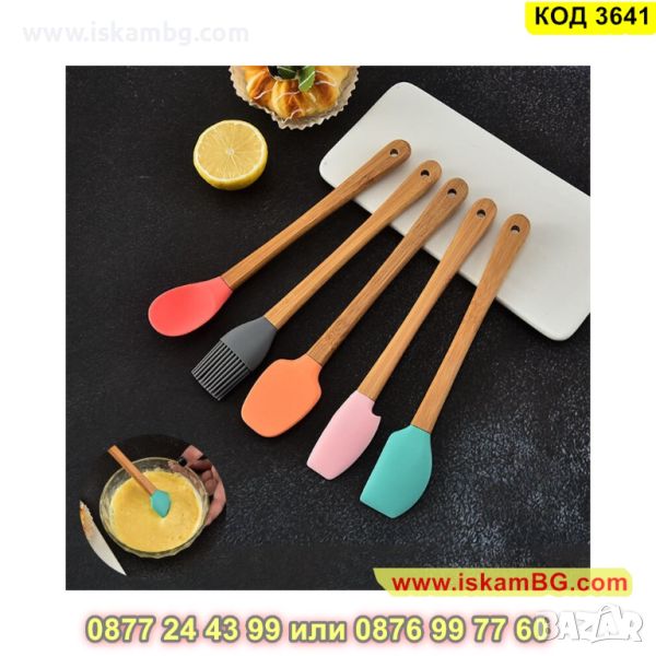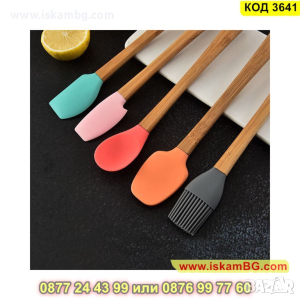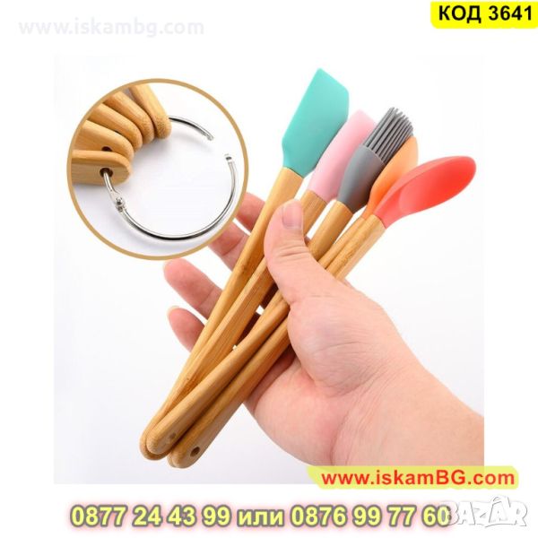 Комплект 5 бр силиконови прибори с дръжки изработени от бамбук - КОД 3641
