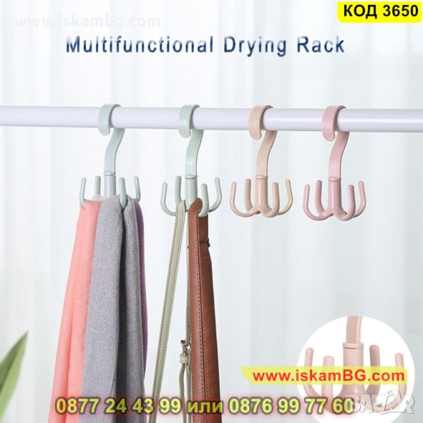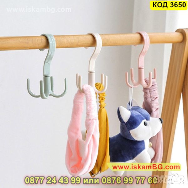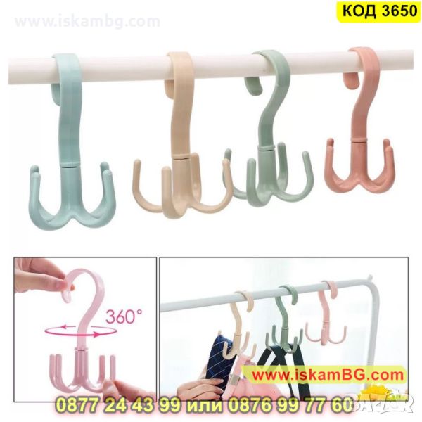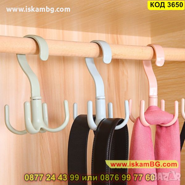Въртящата се закачалка, която е предназначена за поставяне в гардероб притежава 4 кукички, на които ще можете да закачите своите любими дрехи или аксесоари - шапки, чанти, дрехи, палта, шалове и други. Практична и лесна за използване, тази закачалка има въртяща се глава на 360 градуса. По този начин Вие ще можете лесно да достигнете всяка деха или аксесаор, който сте закачили на нея. Закачалката за дрехи може да се поставя и използва дори и в банята, защото разполага с водоустойчива основа, на която можете да сушите мокри дрехи на въздух или на закрито. Размерите на креативната въртяща закачалка за дрехи са: 14 х 8 см.