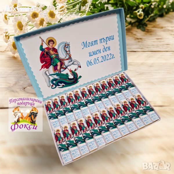 20 или 32 броя индивидуално опаковани шоколадови бонбони, с изписано име и дата на празник.