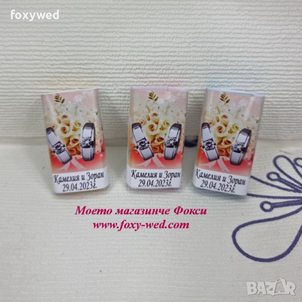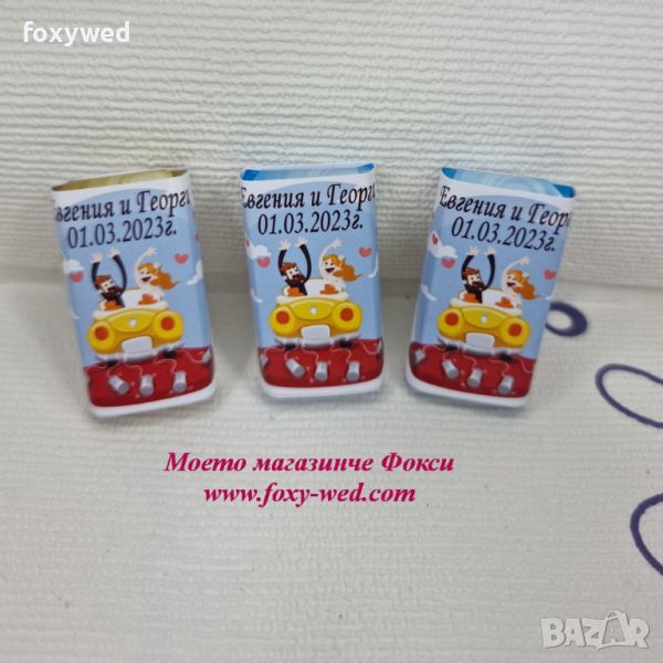 Кутия с персонализирани шоколадови бонбони, опаковани по единично, с индивидуален дизайн и надпис – име и дата на събитието.