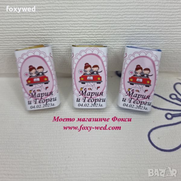Кутия с персонализирани шоколадови бонбони, опаковани по единично, с индивидуален дизайн и надпис – име и дата на събитието.