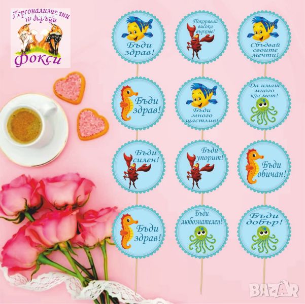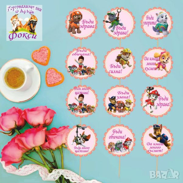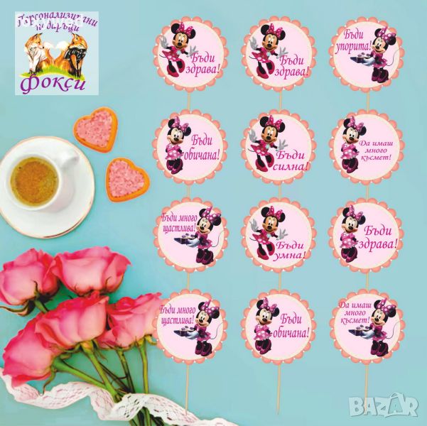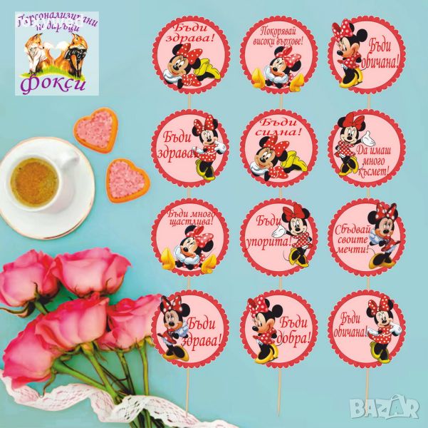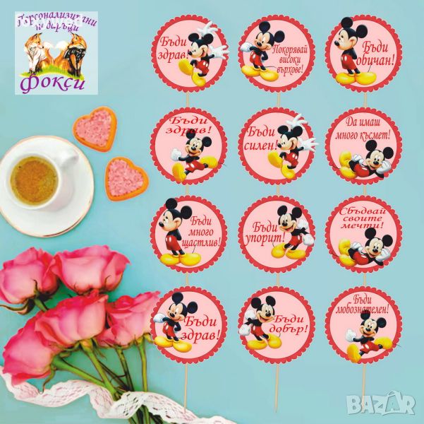 Комплект от 12 броя топери с пожелания за мъфини, тортички, хапки или други вкусотии. изработени в цвят и с герой по ваш избор, изцяло съобразен с темата на вашия празник