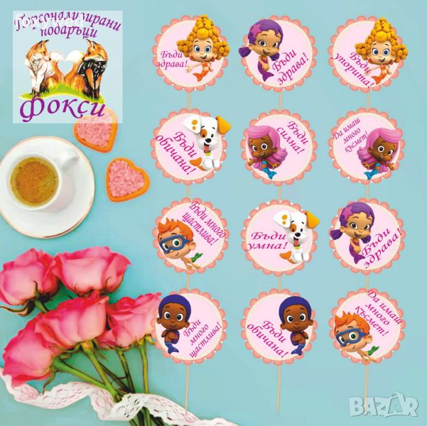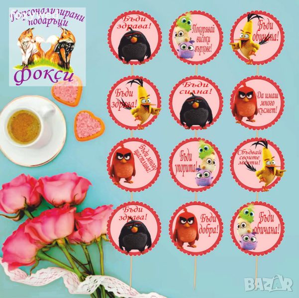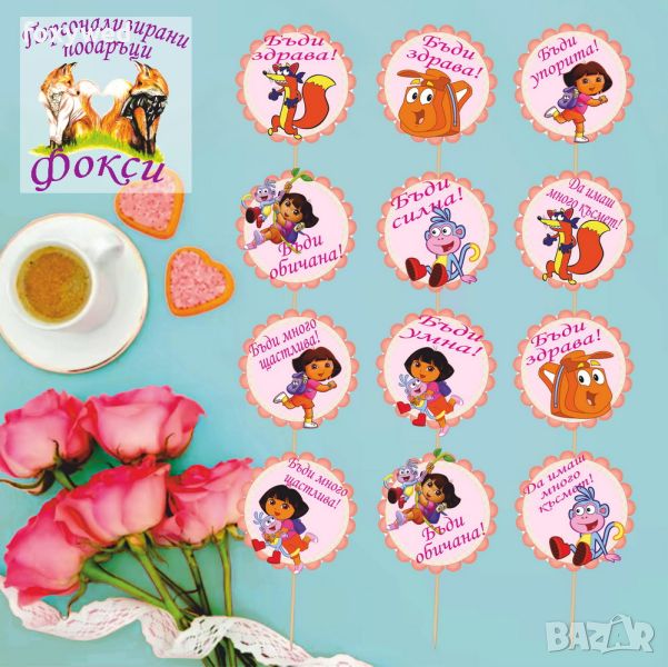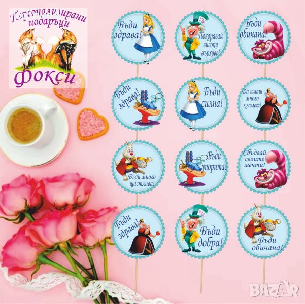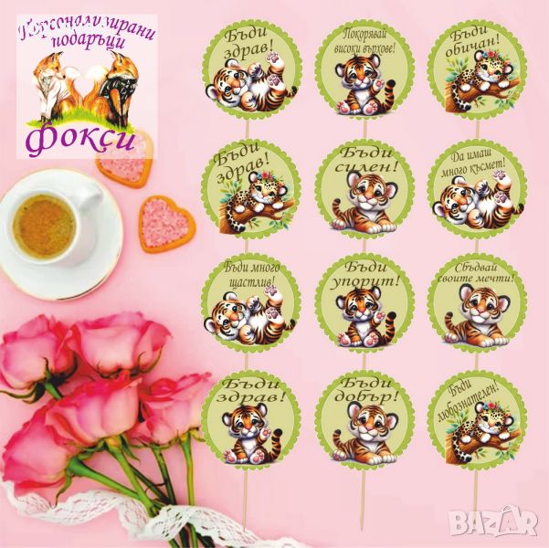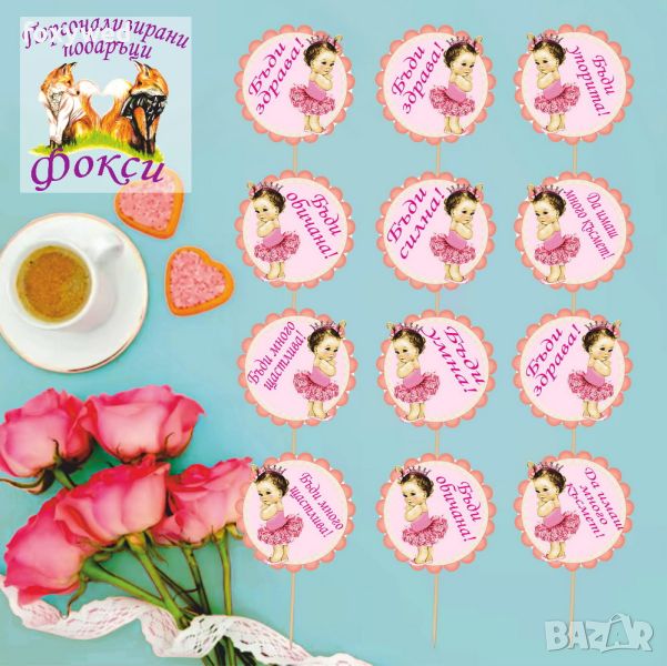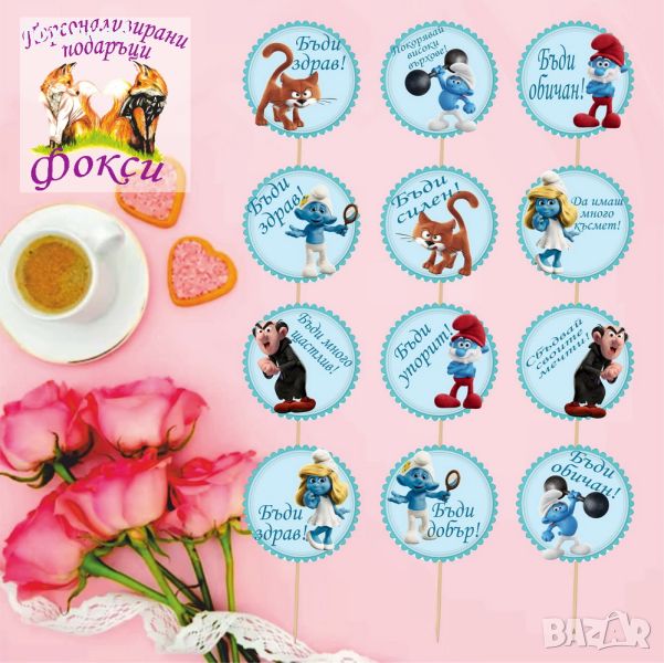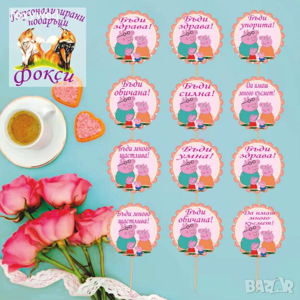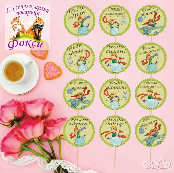 Комплект от 12 броя топери с пожелания за мъфини, тортички, хапки или други вкусотии. изработени в цвят и с герой по ваш избор, изцяло съобразен с темата на вашия празник