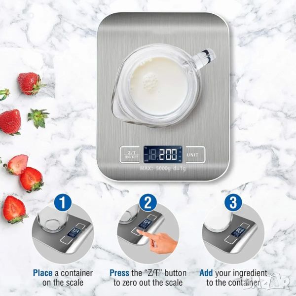 • Цифрова везна: Тази 5-килограмова електронна везна е задължителен инструмент за вашата кухня, предлагаща прецизни и точни измервания на теглото със своя цифров дисплей.
