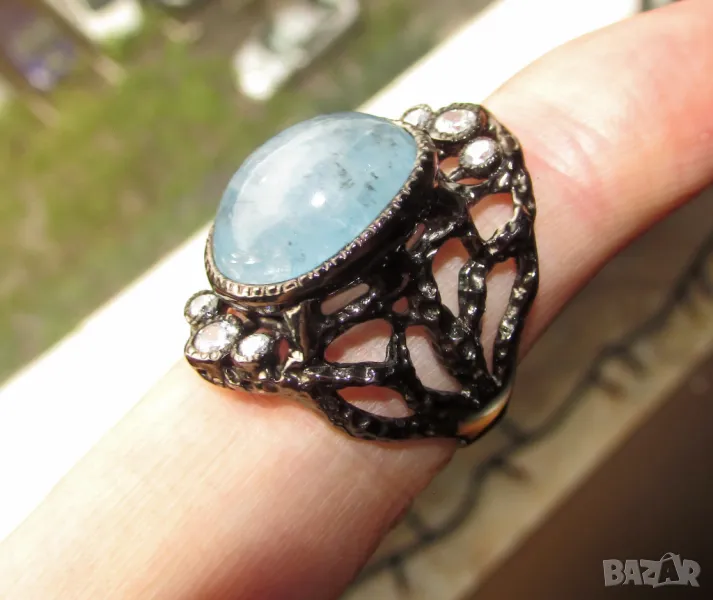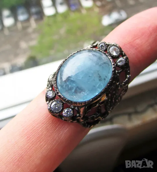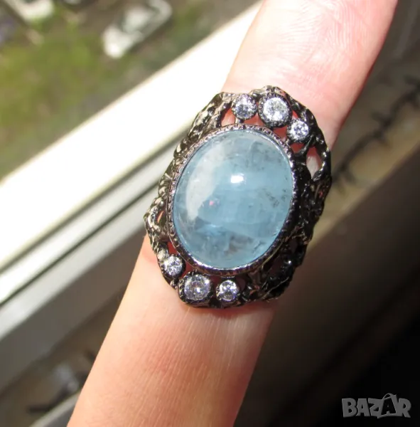 Сребърен пръстен с аквамарин 16x13, тегло 10.8гр. Произход Африка. Другите камъни са цирконий, халка 1.8. Покирите с черен родий. Цена 150лв.