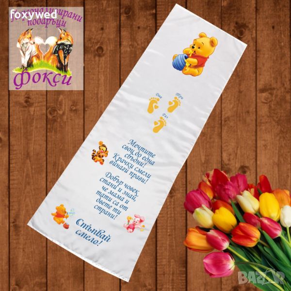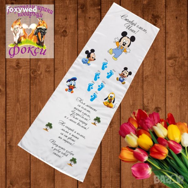 Платното за прощъпулник е изцяло персонализирано с текст пожелание, отпечатване на името на детето, любим герой и бебешки стъпки. При ваше желание може да се добави и датата на прощъпулника, като това няма да оскъпи продукта. Изработено е от плътен, непрозрачен, матов плат фин микрофибър,в бял цвят /100% полиестер/, с размери 50 х 150 см. Не се пързаля!