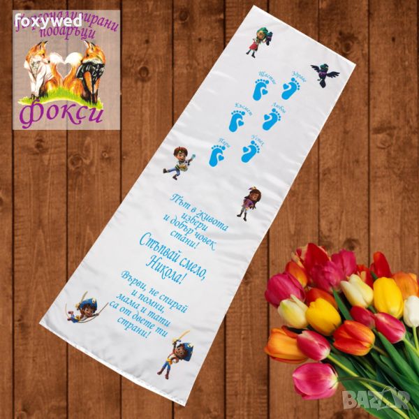 Платното за прощъпулник е изцяло персонализирано с текст пожелание, отпечатване на името на детето, любим герой и бебешки стъпки. При ваше желание може да се добави и датата на прощъпулника, като това няма да оскъпи продукта. Изработено е от плътен, непрозрачен, матов плат фин микрофибър,в бял цвят /100% полиестер/, с размери 50 х 150 см. Не се пързаля!