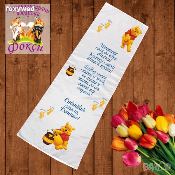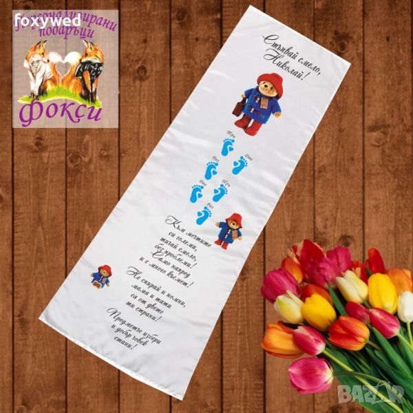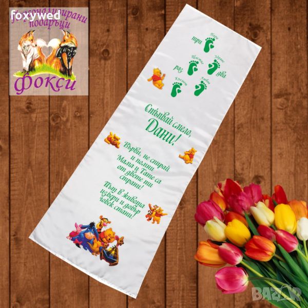 Платното за прощъпулник е изцяло персонализирано с текст пожелание, отпечатване на името на детето, любим герой и бебешки стъпки. При ваше желание може да се добави и датата на прощъпулника, като това няма да оскъпи продукта. Изработено е от плътен, непрозрачен, матов плат фин микрофибър,в бял цвят /100% полиестер/, с размери 50 х 150 см. Не се пързаля!
