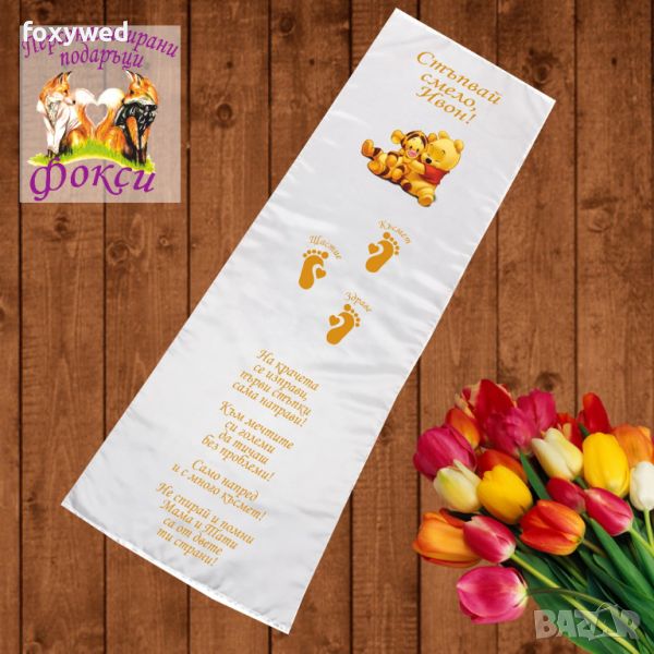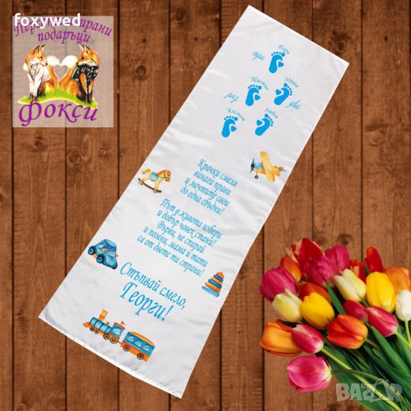 Платното за прощъпулник е изцяло персонализирано с текст пожелание, отпечатване на името на детето, любим герой и бебешки стъпки. При ваше желание може да се добави и датата на прощъпулника, като това няма да оскъпи продукта. Изработено е от плътен, непрозрачен, матов плат фин микрофибър,в бял цвят /100% полиестер/, с размери 50 х 150 см. Не се пързаля!