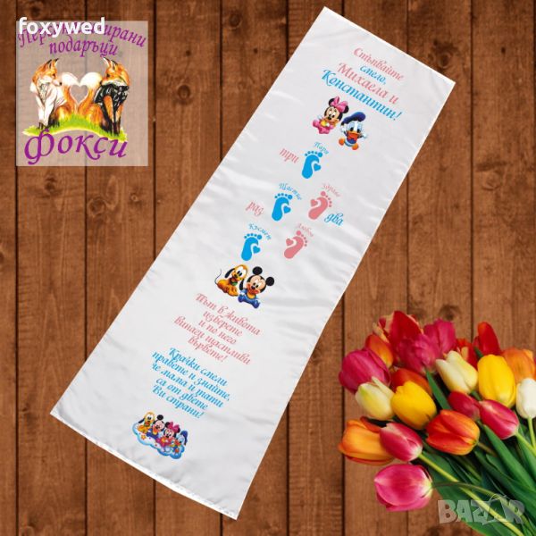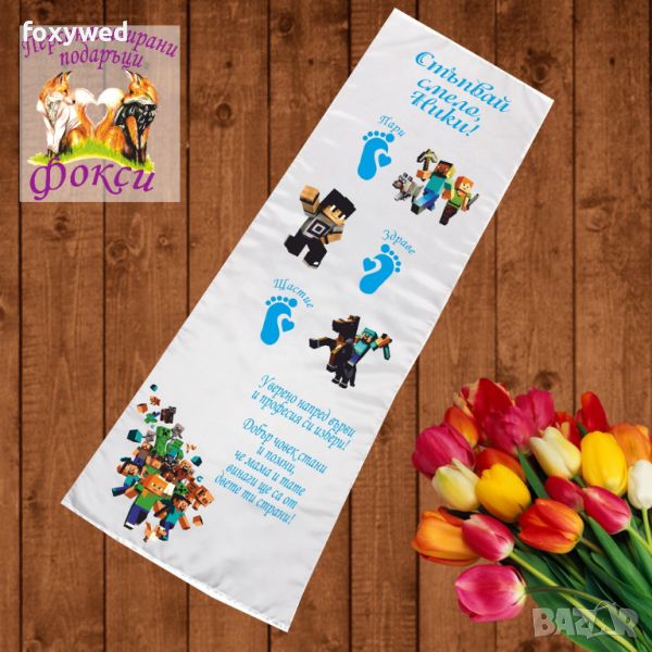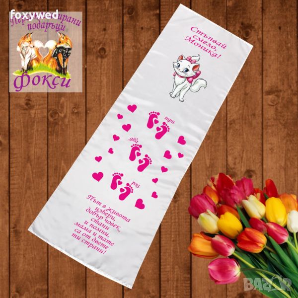 Платното за прощъпулник е изцяло персонализирано с текст пожелание, отпечатване на името на детето, любим герой и бебешки стъпки. При ваше желание може да се добави и датата на прощъпулника, като това няма да оскъпи продукта. Изработено е от плътен, непрозрачен, матов плат фин микрофибър,в бял цвят /100% полиестер/, с размери 50 х 150 см. Не се пързаля!