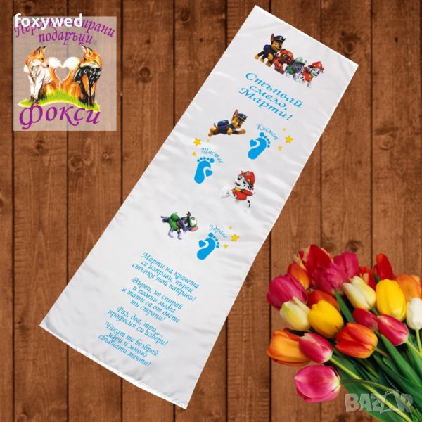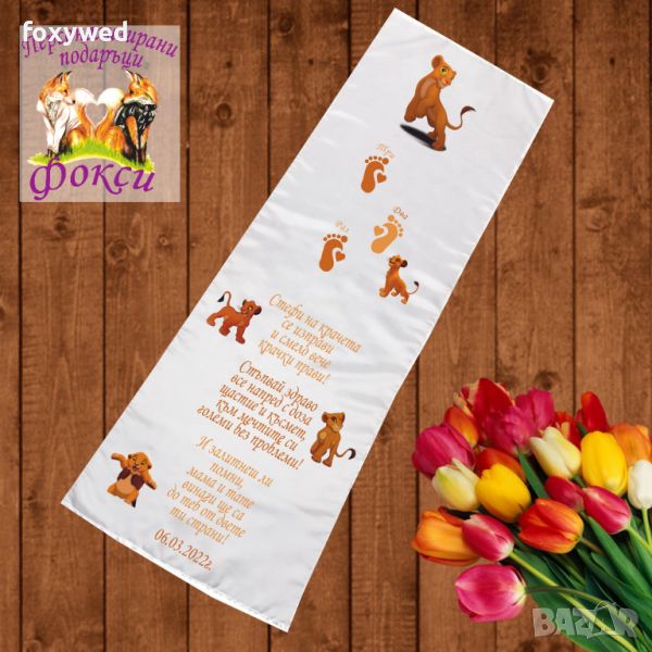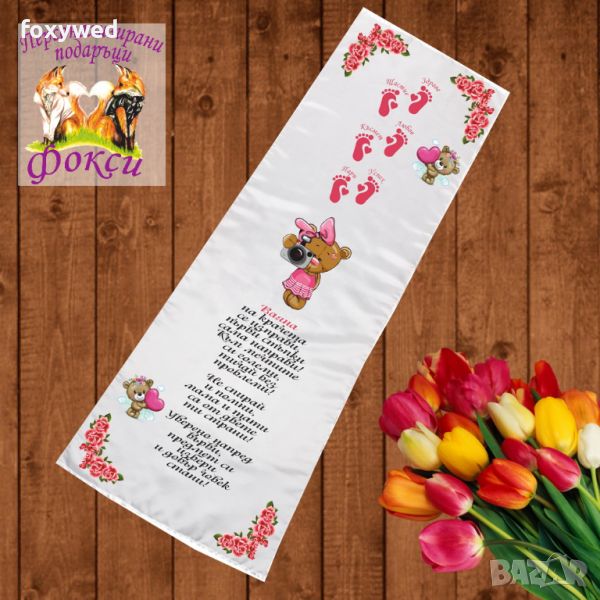 Платното за прощъпулник е изцяло персонализирано с текст пожелание, отпечатване на името на детето, любим герой и бебешки стъпки. При ваше желание може да се добави и датата на прощъпулника, като това няма да оскъпи продукта. Изработено е от плътен, непрозрачен, матов плат фин микрофибър,в бял цвят /100% полиестер/, с размери 50 х 150 см. Не се пързаля!